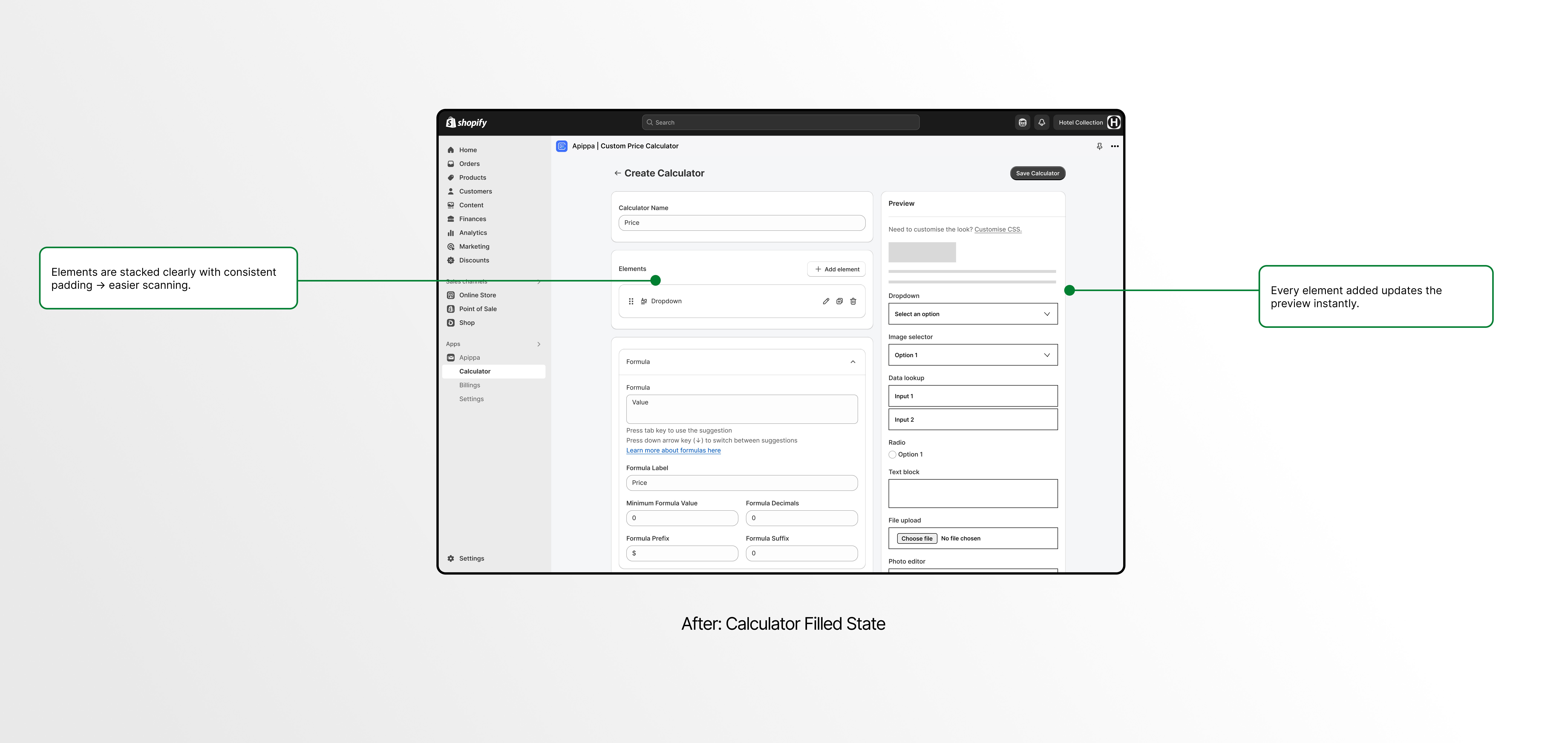 The calculator is a utility built for Shopify merchants who need accurate, rule-based pricing without relying on static tables or manual estimates. Instead of random input fields, it converts complex backend logic into a clean, guided interface.